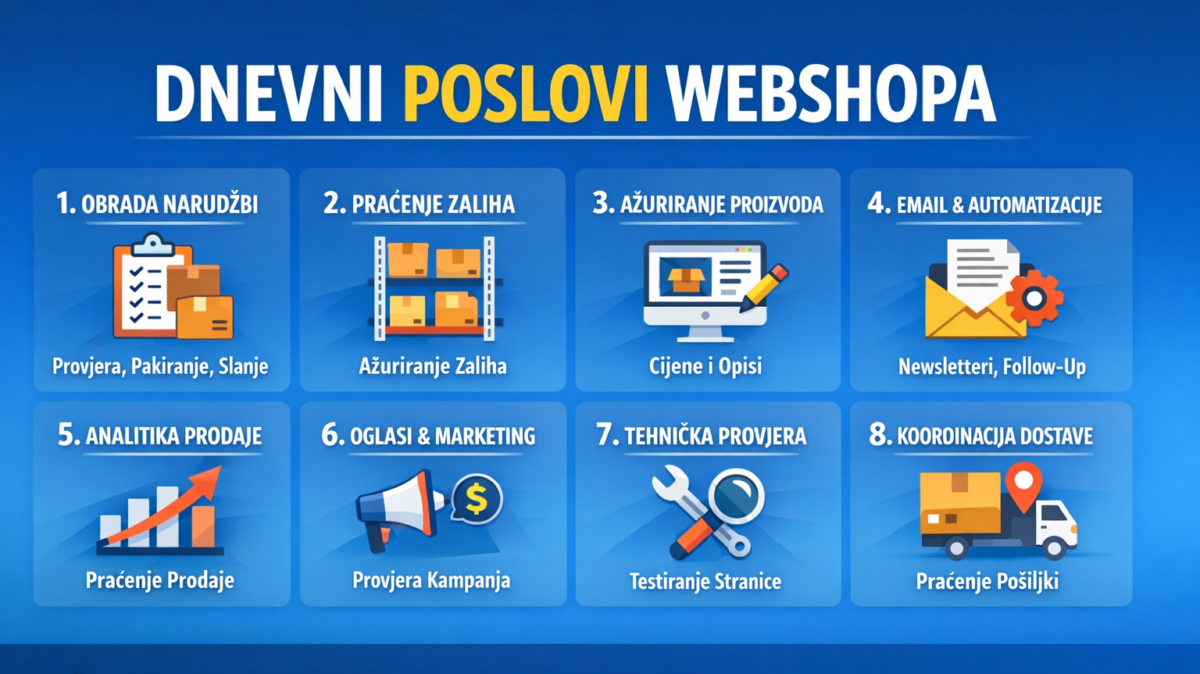 Jer webshop nije “postavi i zaboravi”. Webshop je živi organizam. Svaki dan se nešto događa, mijenja, prodaje, ažurira, provjerava. I upravo tu dolazi ono što većina ljudi nikad ne vidi — background operativa.